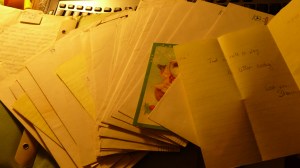 My desk drawer broke the other day, so I emptied the contents to repair the drawer. Part of what I keep in that drawer is a blue binder in which Hubby had kept a journal about how he felt about me, another of his journals from ’93 and a green folder filled with letters I had written him back in ’83. (see picture above)