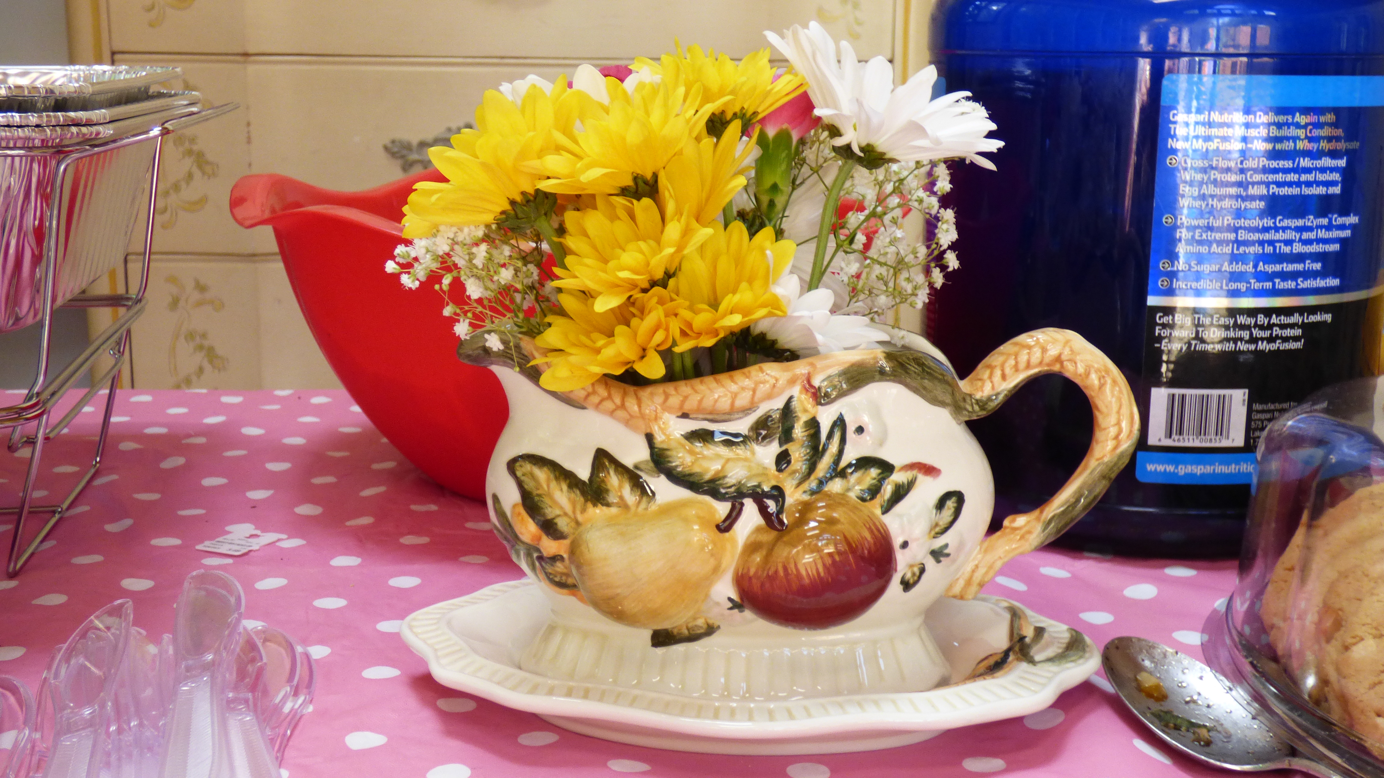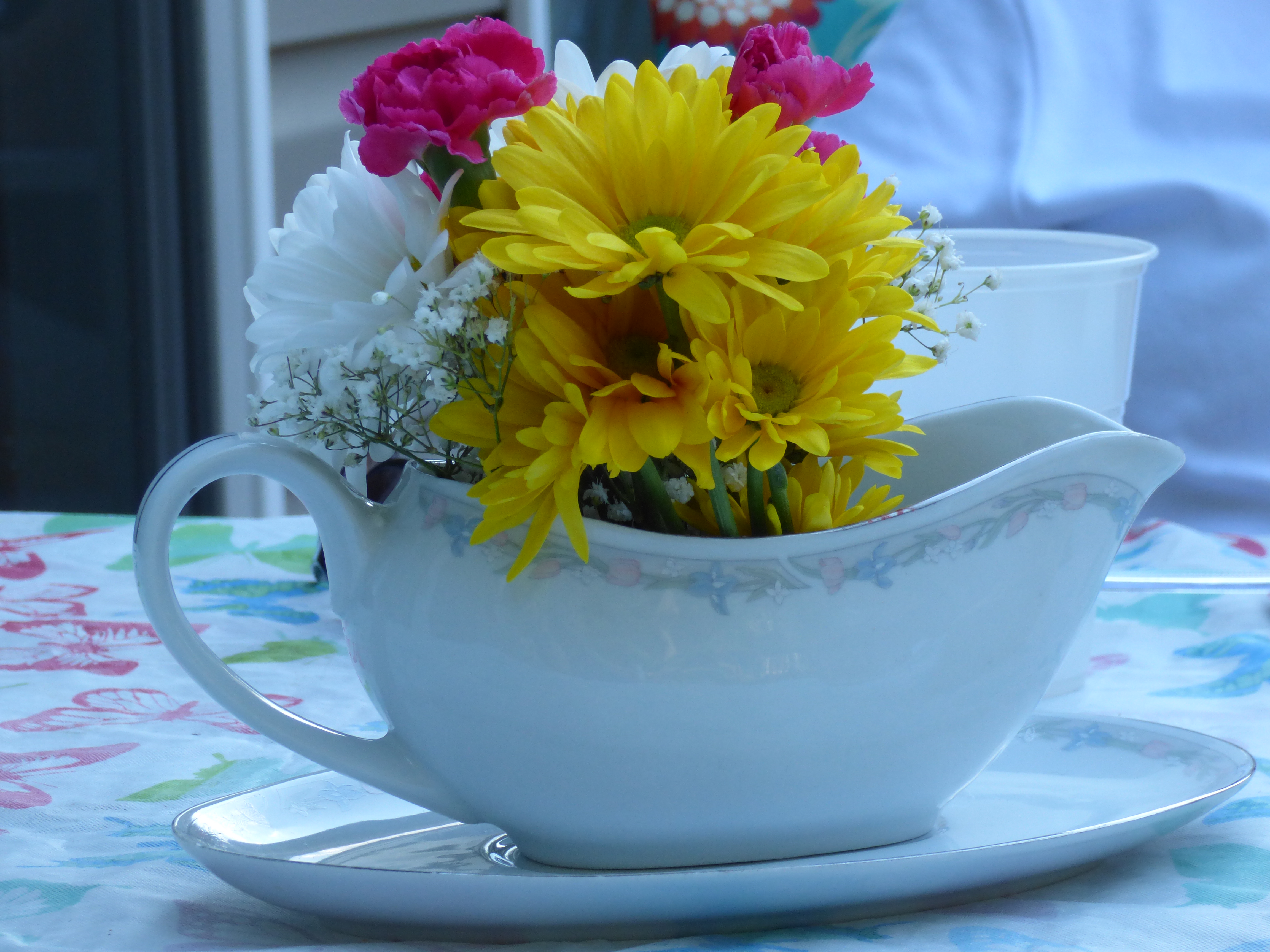 That did it. Hubby was so amused by her vehemence that I figured it only made sense to surprise #4 with a gravy boat themed reception. We began scouring Goodwill and yard sales for gravy boats, alerted all our friends to be on the look-out for boats and even told guests to be sure their gift came with a cheap gravy boat.